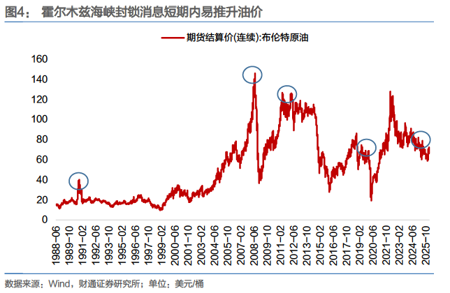 从历史教导看,伊朗动用 “阻塞霍尔木兹海峡” 这一顶点筹码时,外洋油价常常在短期内显耀攀升。1980年两伊战斗爆发后油价从每桶13好意思元飙升至34好意思元;1990年8月海湾战斗爆发后,2个月内油价升至40好意思元/桶,涨幅超100%;2008年的伊核危境中,伊朗屡次要挟阻塞海峡,一样凯旋刺激了阛阓对油价回升的预期。2019—2020 年及 2025 年,屡次霍尔木兹海峡阻塞联系音讯,均激勉油价脉冲式波动。